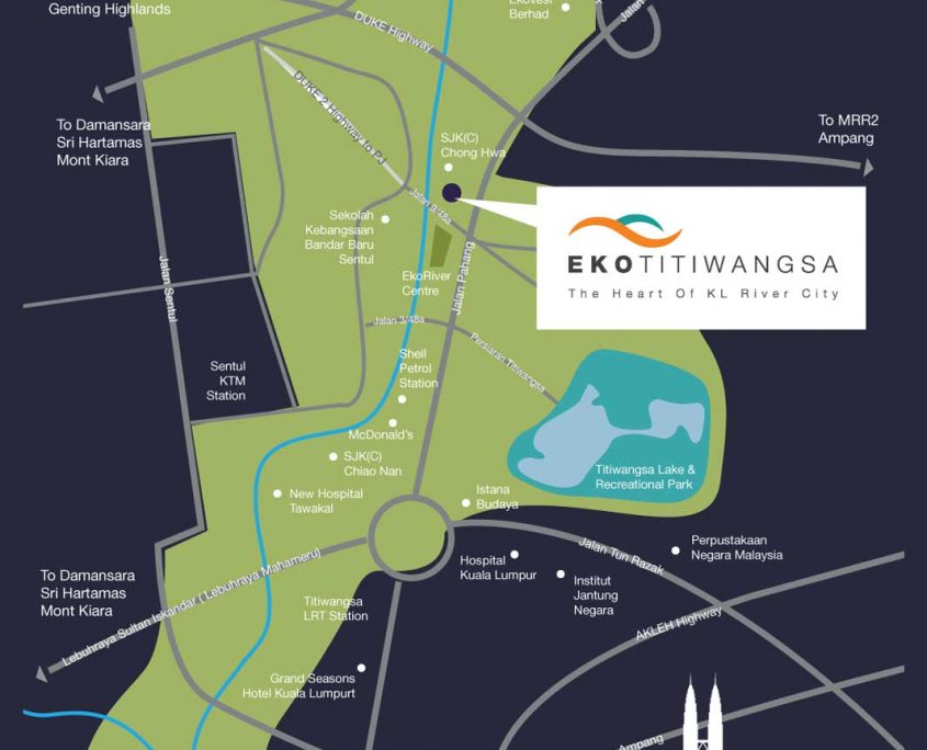 EKOTITIWANGSA is located along Titiwangsa, DUKE Highway and is at the centre of a new and upcoming River Front Development by Ekovest. It comprises 3 blocks of freehold service apartments with a total of 696 units and retail spaces (approximately 42,000 sf). The luxury suites have built-up size ranging from 820sf – 1340sf. The modern contemporary design includes highly unique exterior and interior decoration to create an inspiring living space full of natural light and yet maintaining the importance of comfort. EKOTITIWANGSA is connected to a 7-storey shopping mall (approximately 600,000sf) with breath-taking view of the spectacular KL skyline. For those who demand modern conveniences as well as secured living, EKOTITIWANGSA offers 24-hour CCTV surveillance with 3-tier security feature complete with smart card access and guard patrol.